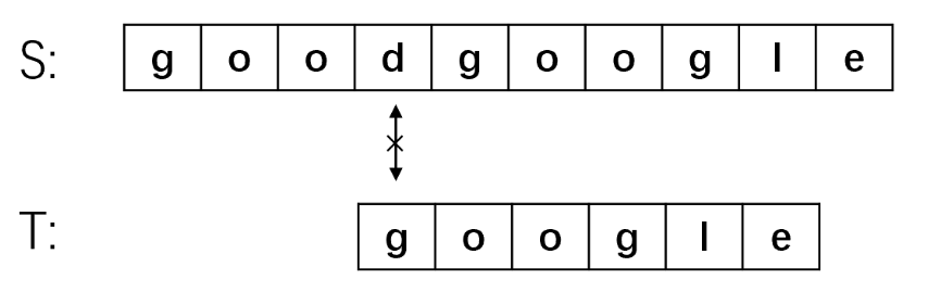 举个例子:主串S=“goodgoogle”,子串T=“google”