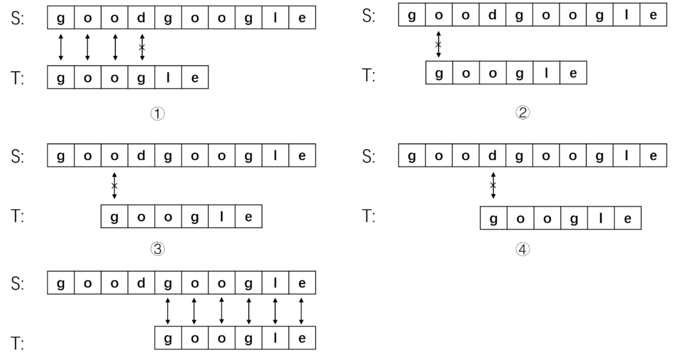 - 还是第一步就匹配失败,将主串指针移动到第五位S[4],子串指针指向开头,继续匹配
