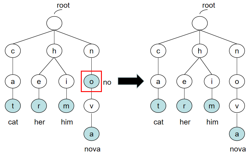 情况三:待删除字符串末尾为叶节点,并且中间有其它单词。逐一删除节点,直到待删除节点是另一个字符串的结尾为止,例如删除 nova。