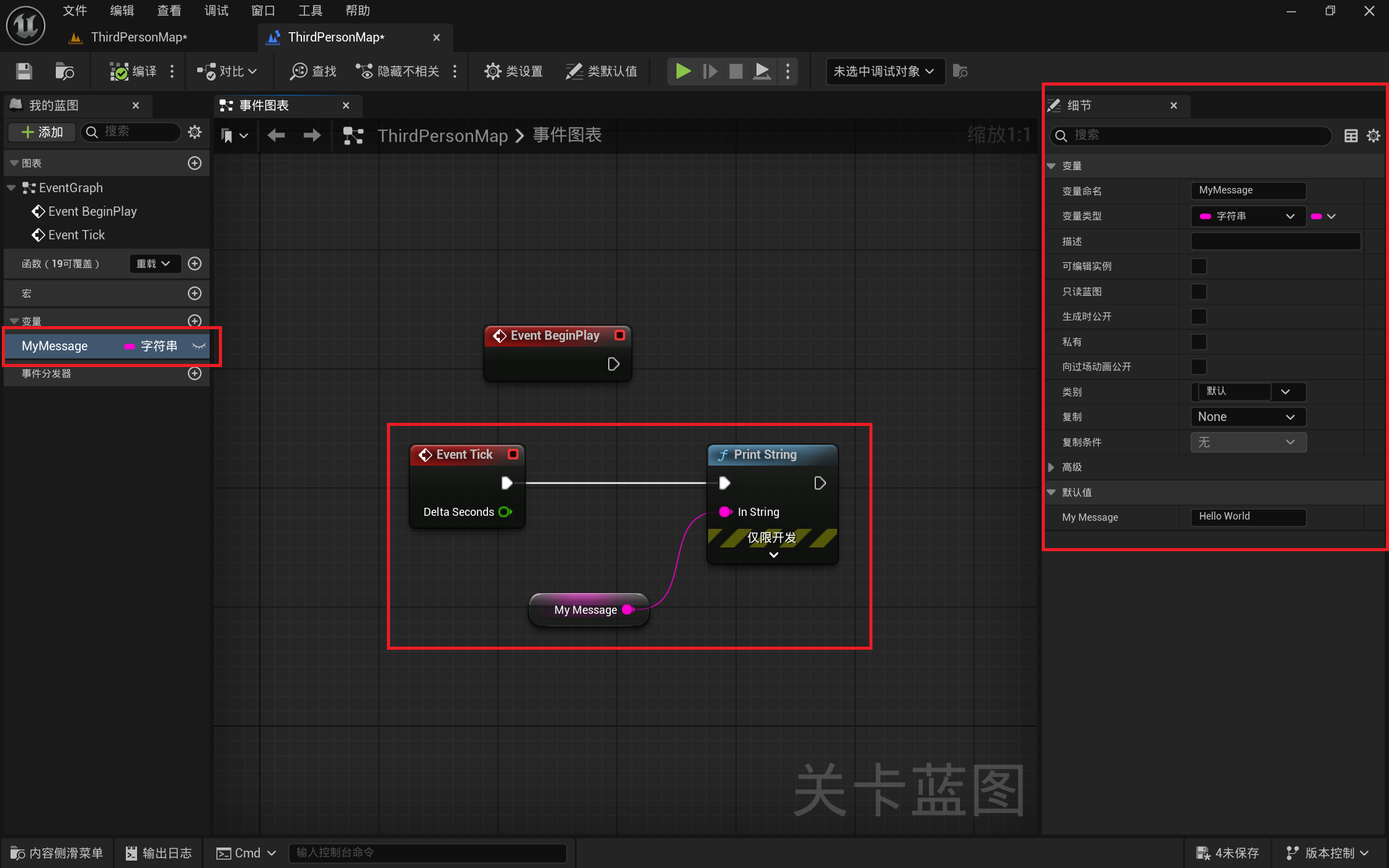 下图两个事件节点类似于unity的start函数和update函数,start函数在开始时执行一次,update函数每一帧都会执行
